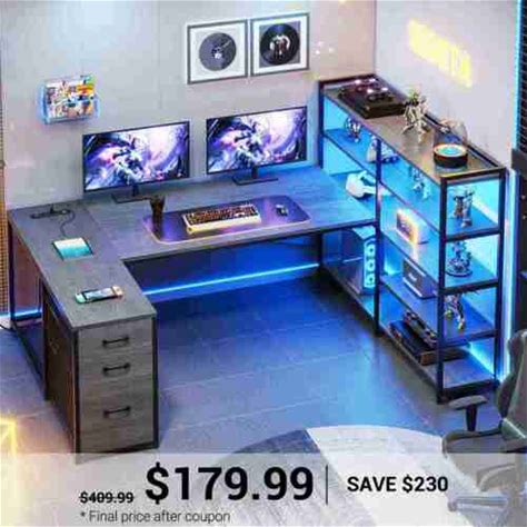 LED Gaming Desk With Power Outlet & Reversible Shelves Modern Computer Workstation | Drop Dash Deals