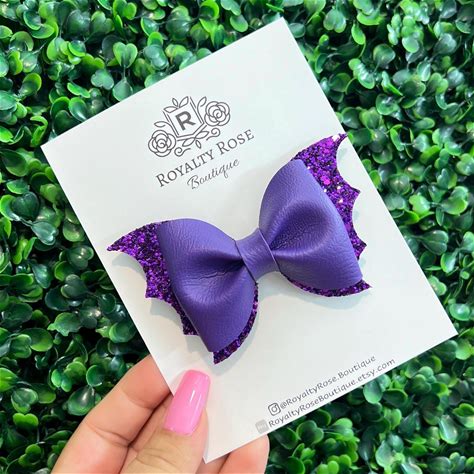 Halloween Purple Glitter Bat Faux Leather Hair Bow, Vampire Clip, Bat Party Favor